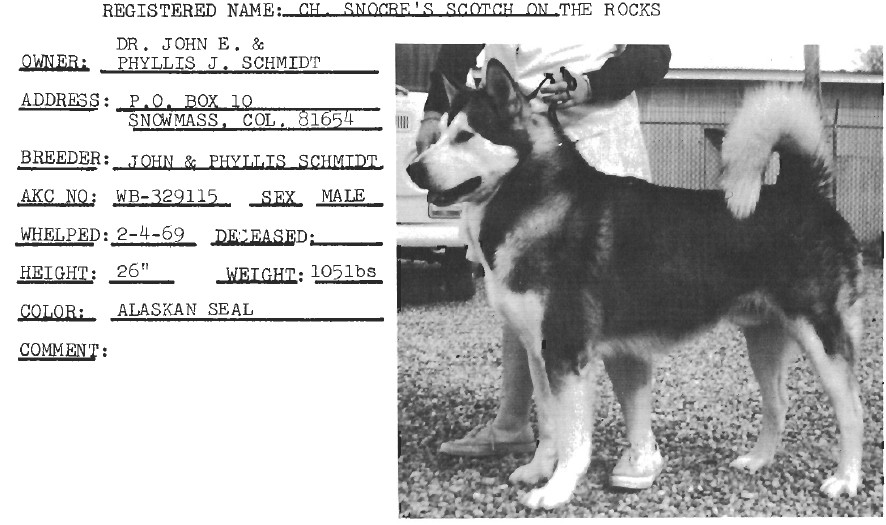 ![]() Snocre's Sikku, Ch, wolf grey & white, 04/02/1969, OFA 289 | |||