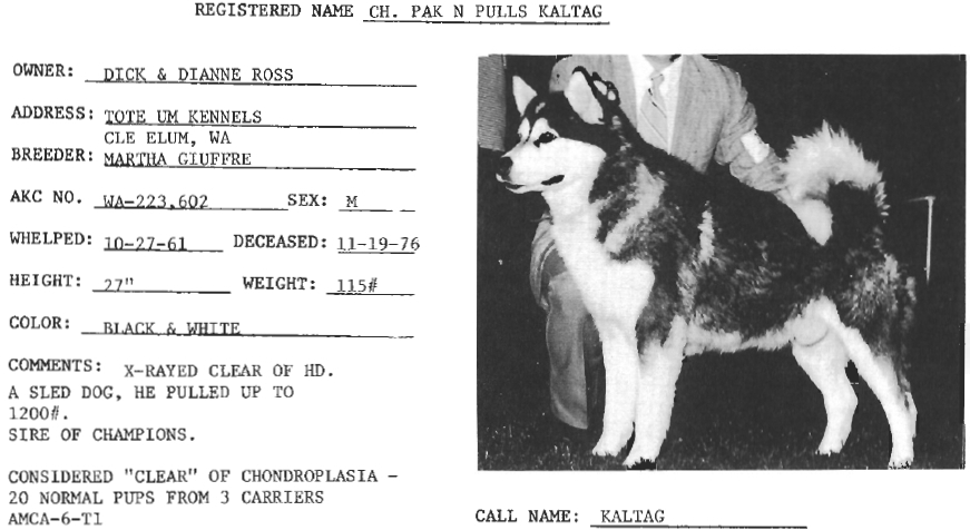| Père Klahowya Kasaan of Tote-Um, Ch., AMA seal & white, 27/03/1967 | ![]() Pak N Pulls Kaltag, Ch, black & white, 27/10/1961 | Maloot Of Kuvak, AMA black & white, 29/01/1959 | Stikeen of Tyee, 17/04/1957 |