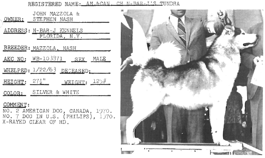 | Sandy Snowcone, white, 17/06/1972 | ![]() N Bar J's Tundra, Am/Can Ch, silver & white, 22/01/1968 | ||