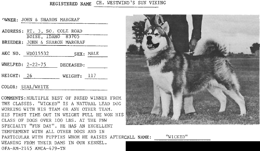 ![]() Tote-Um's Black Mischief, Am/Can Ch., Black & White, 29/10/1976 | ![]() Westwind's Sun Viking, CH, Grey & White, 22/02/1975, HD Normal | ![]() Talak of Kotzebue, Ch, wolf grey & white, 26/03/1970, OFA-387 | |