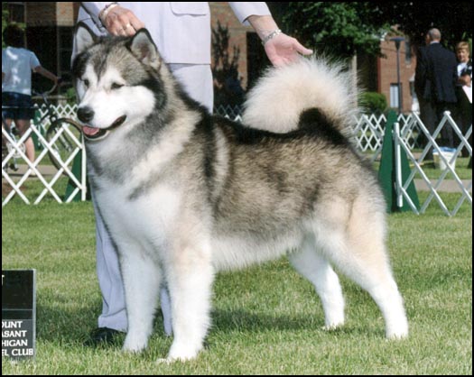 | Miatuk Totem's Tianna, CH, seal & white, 19/04/1994 | Barrenfield's Budwieser, CH, Grey & White, 10/04/1990, OFA HD Exc | ||