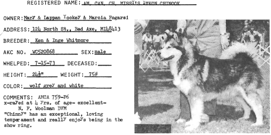| Mère Roy's North Star, Seal & White, 11/01/1979 | ![]() Missy's Yukon Chinook, Am.Can.Ch., Grey & White, 15/07/1973 | Chechacko Bud, Grey & White, 05/02/1970 | Matuuk of Chandler Hill, grey & white markings, 20/04/1967 |